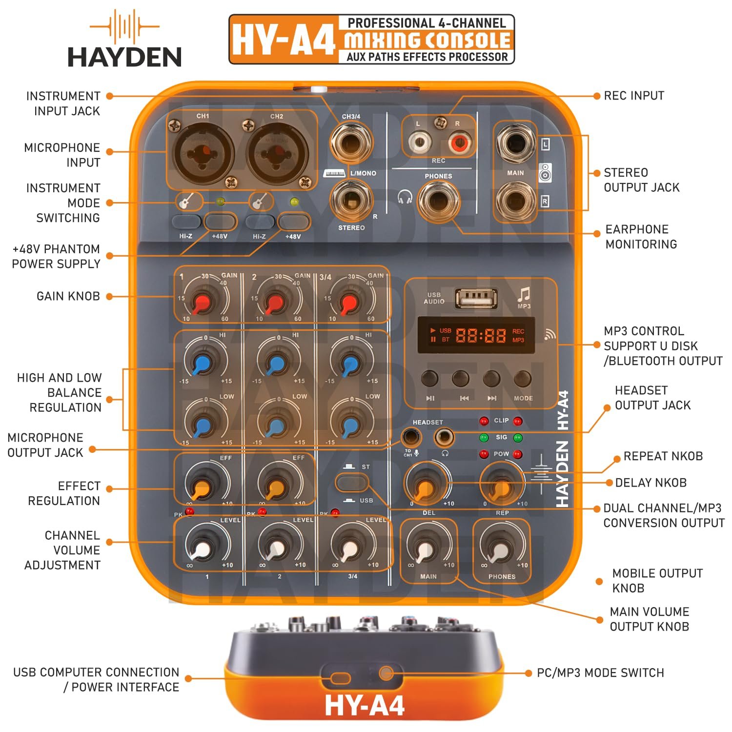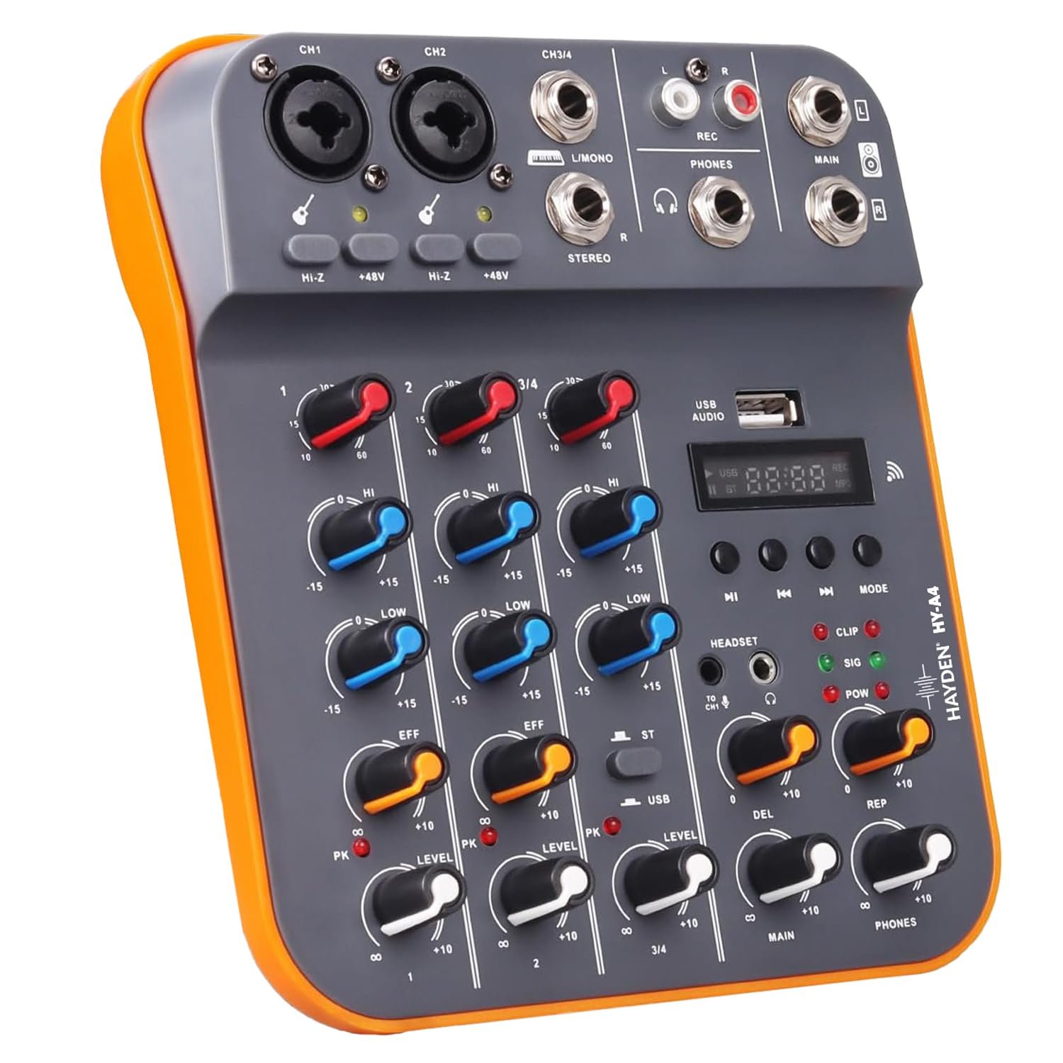 - Professional 4-Channel Audio Mixer – HAYDEN HY-A4 features XLR and 6.3mm balanced inputs, delivering high-fidelity sound with a gain range of +10dB to +60dB, low noise (-80dBu), and a high signal-to-noise ratio (110dB/112dB) for crystal-clear recording, podcasting, DJing, live streaming, and performances.