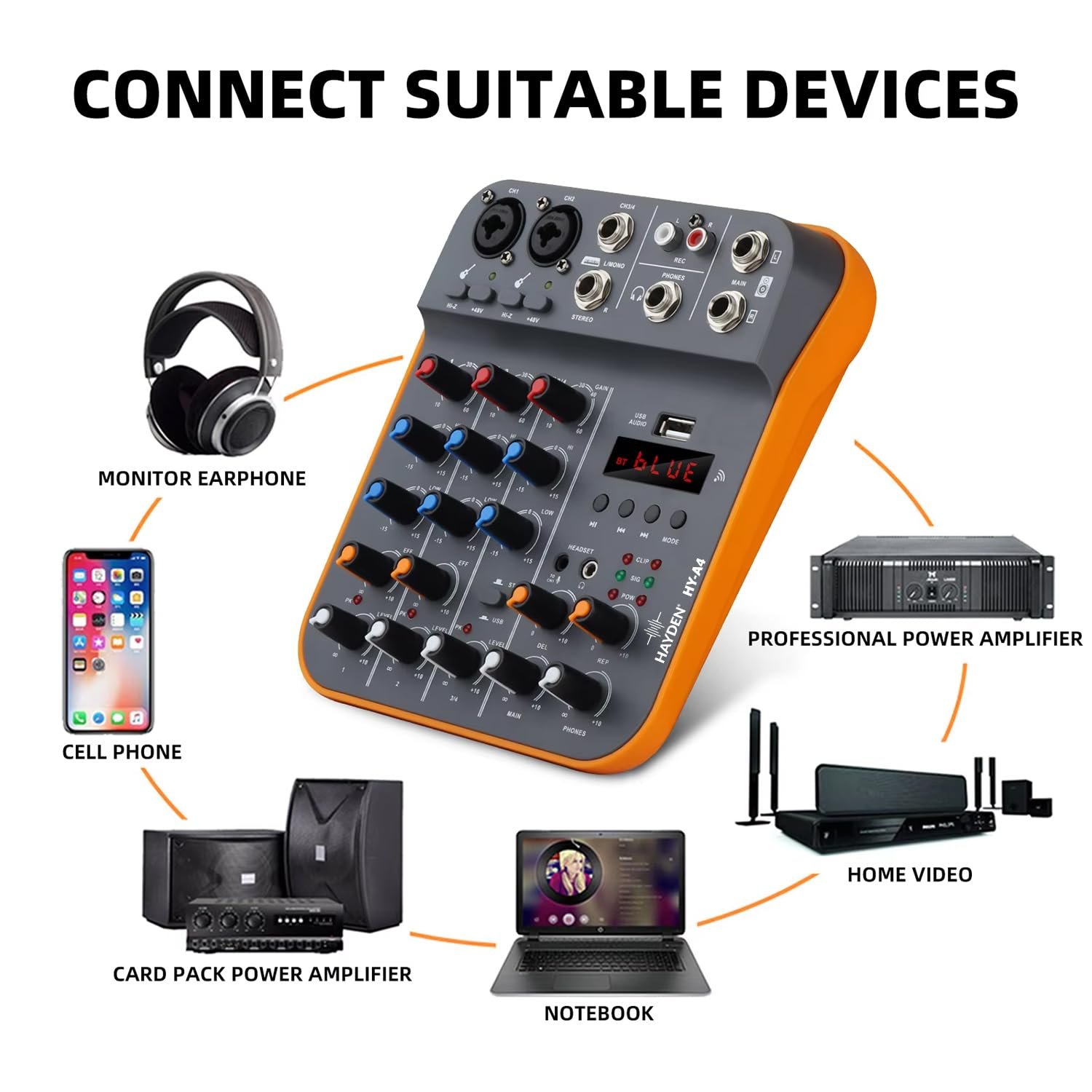 - Built-in Bluetooth & USB Audio Interface – Enjoy wireless music streaming via Bluetooth or connect directly via USB for professional-quality recording and live mixing. The HY-A4 functions as a USB sound card, making it perfect for home studios, content creators, and musicians.